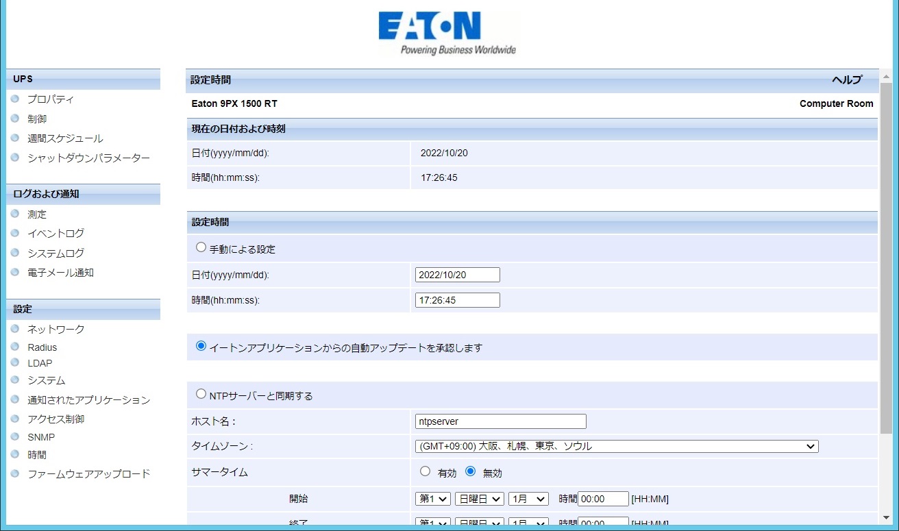 NTPサーバーが存在しなければ、[手動による設定]を選択して現在日時を入力して保存します。そのあと、[イートンアプリケーションからの自動アップデートを承認します]を選択して保存します。