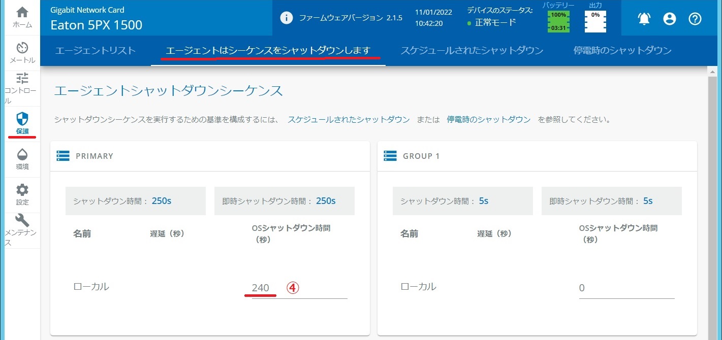 PRIMARYのローカルのOSシャットダウン時間(秒)の欄に、UPS1のNetwork-MSを参照して同じ値を設定します