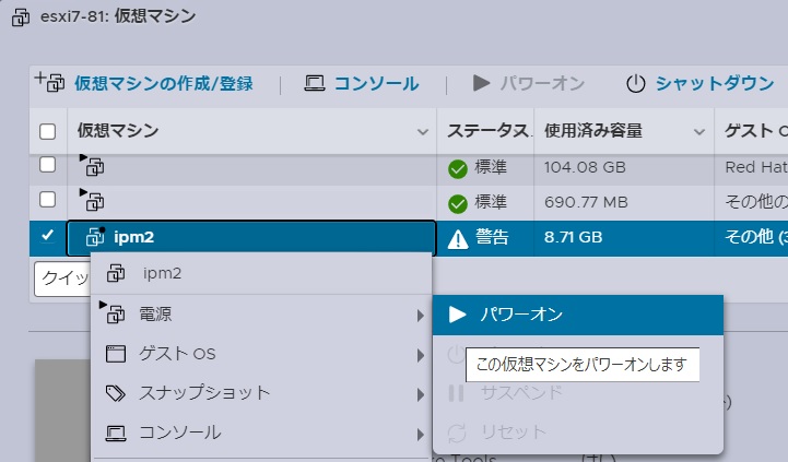 IPM2仮想マシンを選択して[パワーオン]を押します。