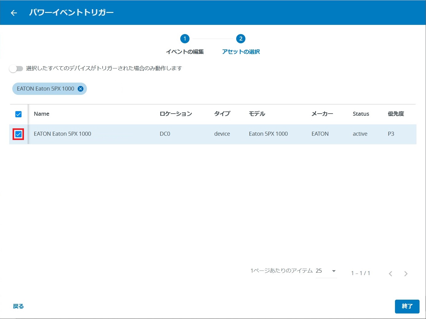 [選択したUPSがAC停電した時]を条件とするトリガーができました。