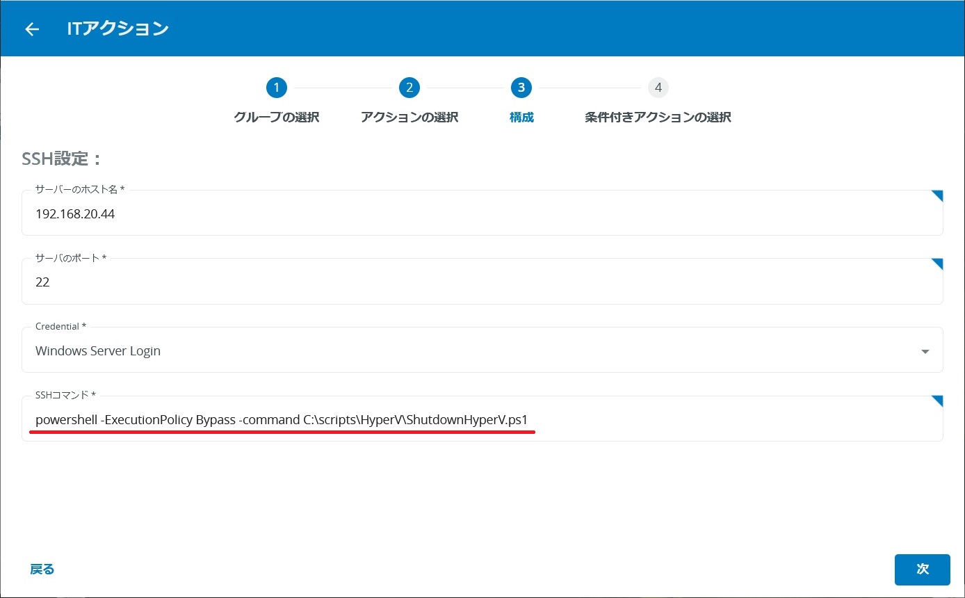 3.Windowsのシャットダウンは、Windows内にシャットダウンスクリプトを配置し、IPM2がWindowsにSSH接続してそのスクリプトを実行することで実現します。