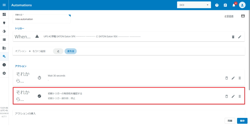 ここでUPSを2台選択すると、どちらかのUPSに障害があった際に自動化設定(オートメーション)が実行されます。