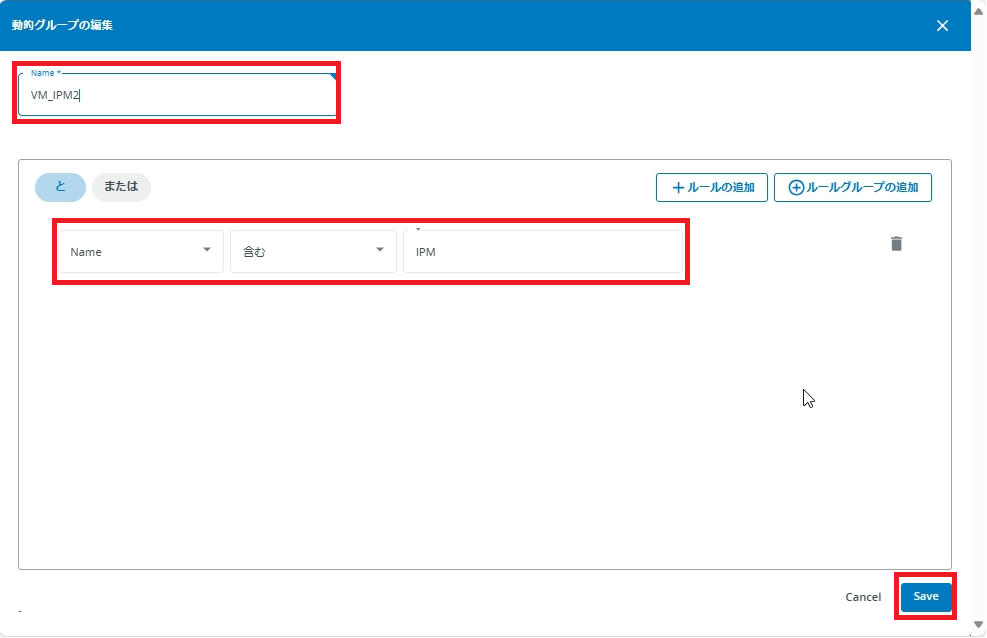 「アセット」-「ダイナミックグループ」画面から「作成」をクリックし、以下のようにダイナミックグループのルールを編集し、「Save」をクリックします。