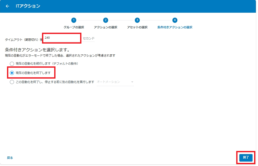 「タイムアウト(期限切れ)後」を240秒に変更し、「現在の自動化を終了します」にチェックを入れ、「終了」をクリックします。
