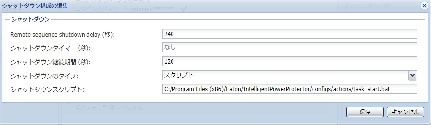 シャットダウンスクリプト:C:/Program Files (x86)/Eaton/IntelligentPowerProtector/configs/actions/task_start.bat
