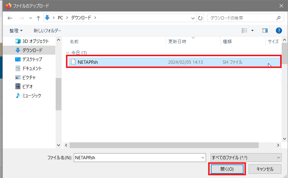「ファイルのアップロード」ウィンドウにて、先ほど作成した.shファイルを選択し「開く」をクリックします。