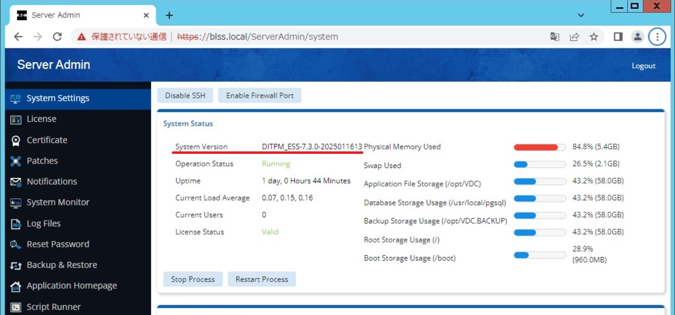 Server Adminにログインすると、System Status内のSystem Versionにバージョンが記載されています。