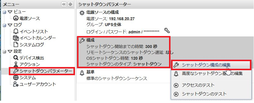 「設定」-「シャットダウンパラメーター」に移動し、「構成」を右クリックします。「シャットダウン構成の編集」をクリックします。