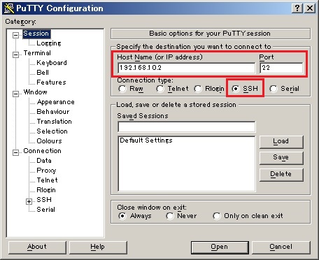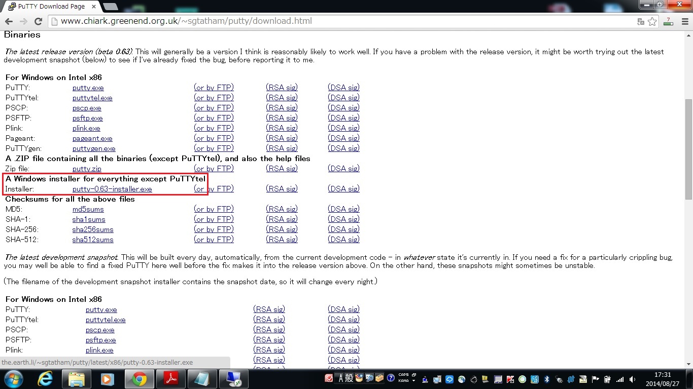 Putty.orgからPuTTY 0.63をダウンロードしてインストールします。