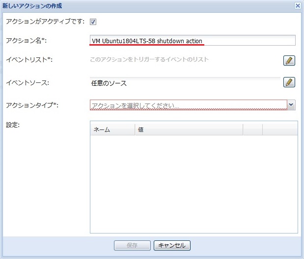 アクション名:任意 (例:VM 仮想マシン名 shutdown action)