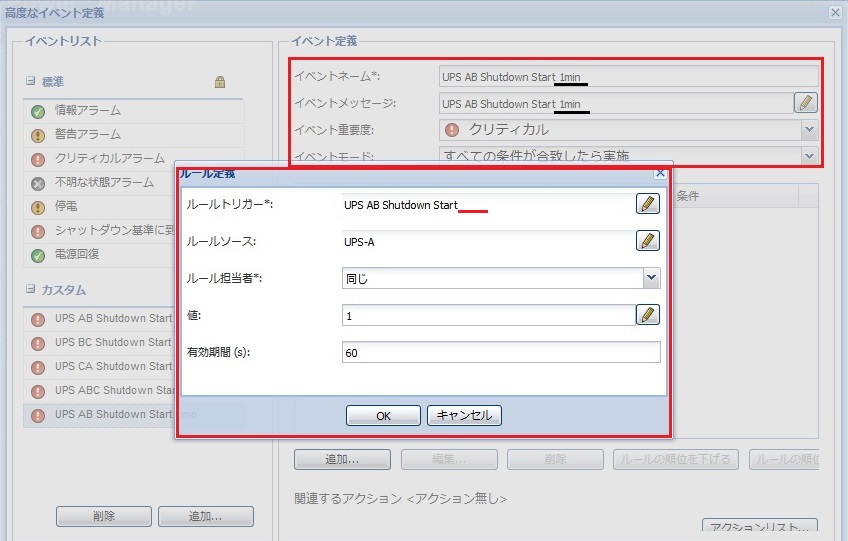 この後の解説ではイベント UPS ABが発生した後、1分間隔でイベントを8回発生させています。アクションは任意のイベントと関連付け可能なため、例えば、3分後、5分後、8分後のイベントと関連付けて、アクションを実行させる事ができます。アクションと関連付けていないイベントが何個あっても構いません。