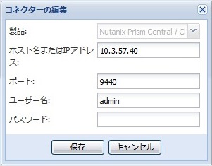 プルダウンの中から、Nutanix Prism / Centralを選択し、PrismのIPアドレス、ポート、ユーザー名、パスワードを入力して保存します。