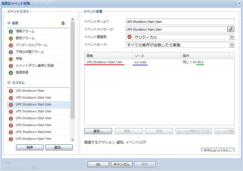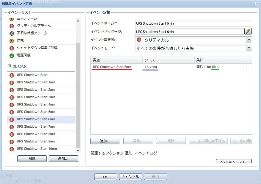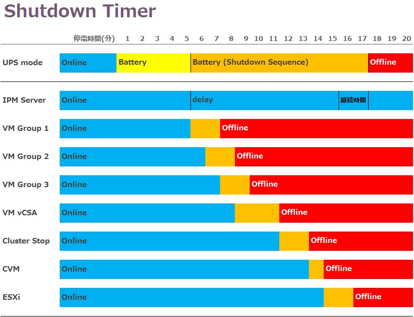 5分経過後に復電しても、UPSのシャットダウンまで全てのアクションが実行されます。