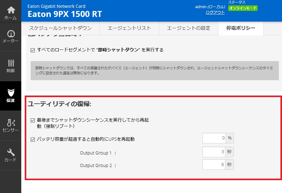 5分経過後に復電しても、UPSのシャットダウンまで全てのアクションが実行されます。