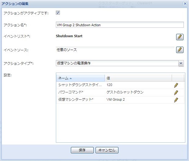 アクション名:任意 (例:VM Group 2 Shutdown Action)