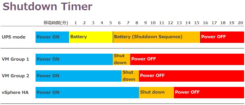 この解説では、5分間のバッテリー運転でシャットダウンシーケンス開始。シャットダウンシーケンスが開始してから10分間後にUPSシャットダウンとしています。停電から5分以内に復電した場合、何もアクションしません。