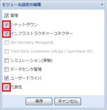 [シャットダウン]、[インフラストラクチャーコネクター]、[冗長性]にチェックを入れて保存します
