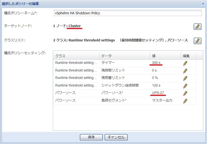 ※UPSが複数台ある場合、台数分の構成ポリシーを作成すること (ターゲットノードで選択したUPSをパワーソースでも選択すること、タイマーは必ず -1)